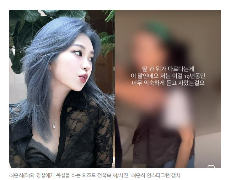 이어 개인 인스타그램에 할머니를 비난하는 돌발 댓글을 잇따라 올렸다. 최진실의 딸은 정옥순 여사에 대해 "남자친구와 함께 집에 들어갔다고 하는 것은 명백한 거짓말이다. 나는 그날 혼자 집에 왔다. 알고 보니 할머니의 욕설을 참을 수가 없었어요. 그래서 나는 남자친구와 함께 경찰에 신고했다."2017년 외할머니의 학대 의혹을 폭로한 적이 있다. 할머니는 최환희(최준희의 동생)에게 증언을 권유했다는 글도 공개했다.