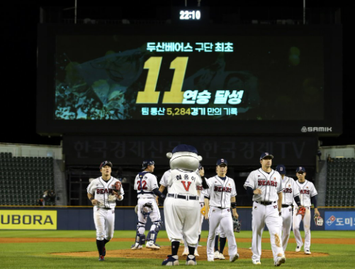 두산 베어스가 사자와 팀 창단 이후 최다 연승 신화를 썼다. 이승엽 감독(47)이 이끄는 두산은 25일 프로야구 잠실 안방경기에서 롯데를 8-5로 꺾고 11연승을 질주했다. 이로써 두산은 김인식 감독 시절이던 2000년, 김태형 감독 시절이던 2018년 기록한 10연승을 뛰어넘어 구단 최다 연승 기록을 갈아치웠다.