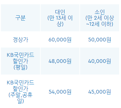 ✔ 내용:* 주중 20%, 주말 10% 할인 적용(정상가 성인/청소년 60,000원, 어린이 50,000원)