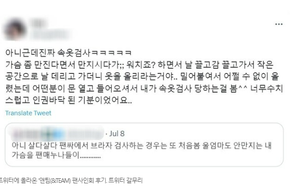 하이브 산하 레이블인 '하이브 레이블즈 재팬' 소속 9인조 보이그룹 '앤팀'은 지난 8일 두번째 미니 앨범 발매 기념으로 대면 팬사인회를 진행하였다. 그런데 팬사인회 직후 트위터등 SNS에 진행요원으로부터 녹음기 등을 차즌다는 빌미로 과도하게 신체수색을 당했다는 경함담이 올라왔다고한다.