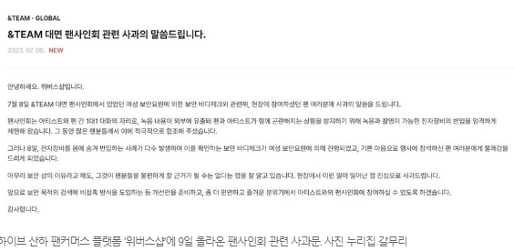 이런 경험담이 온라인상에 퍼지자 팬사인회 하루만인 9일 하이브 산하 팬커머스 플랫폼 '위버스샵'이 사과문을 올렸다