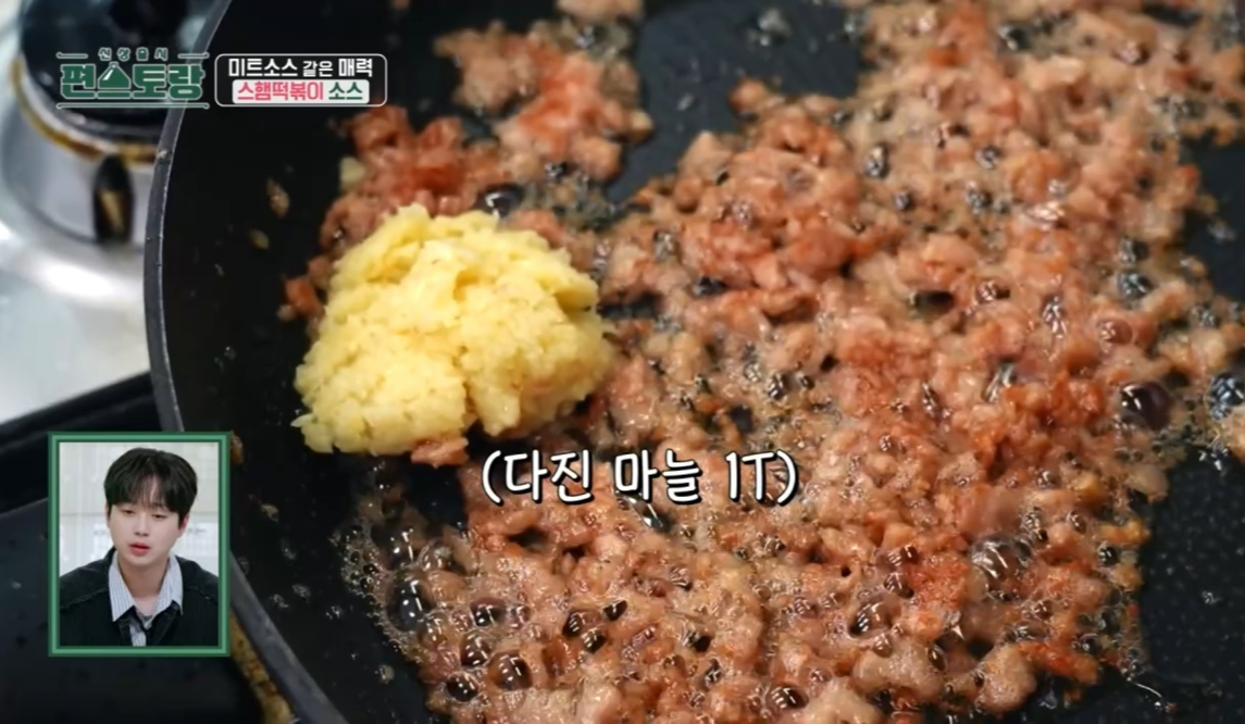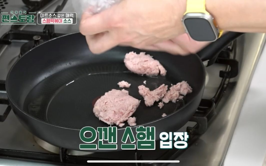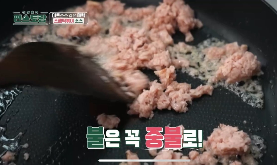 1. 중불로 달군 팬에 식용유 2바퀴를 두르고 으깬 스팸을 넣어 튀기듯이 볶는다.