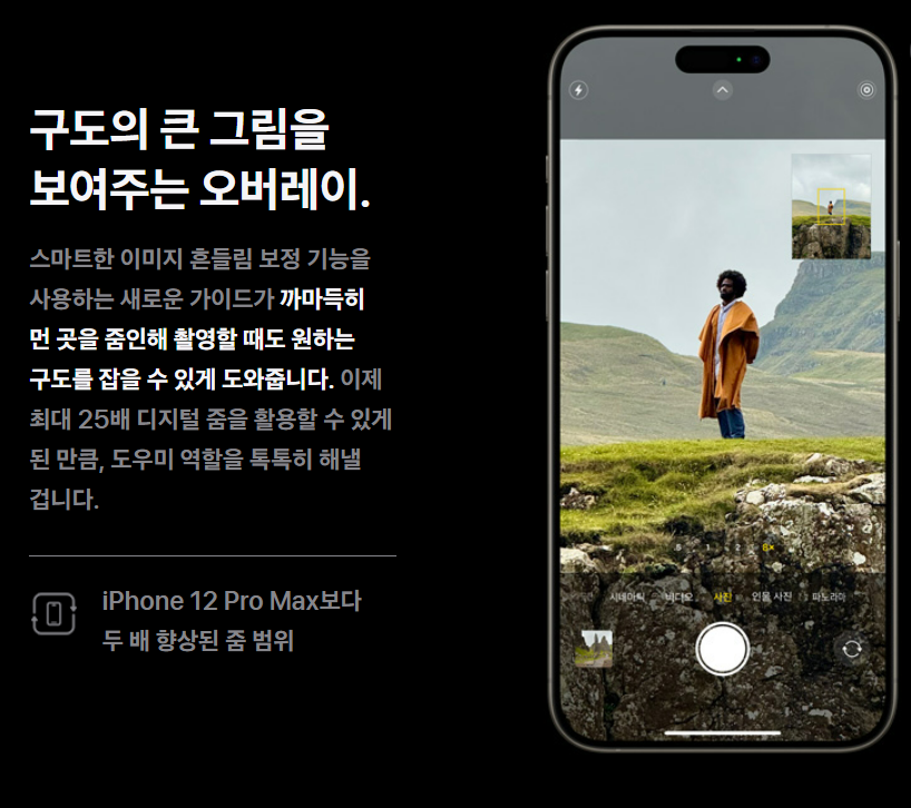 스마트한 이미지를 흔들림 보정기능을 사용하는 새로운 가이드가 까마득히 먼 곳을 줌인해 촬영할 때도 원하는 구도를 잡을 수 있게 도와줍니다. 최대 25배 디지털 줌을 활용할 수 있게 되었습니다.아이폰 12 por max보다 두 배 향상된 줌 범위