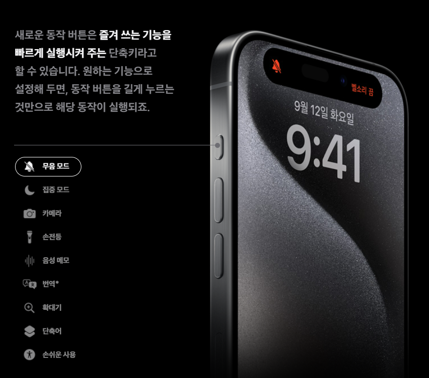 즐겨 쓰는 기능을 동작버튼으로 설정하여 편리하게 사용할 수 있게 기본 설정 그대로 사용할 경우, 동작 버튼을 눌러 벨소리 모드와 무음 모드를 오갈 수 있습니다. 별도의 설정을 통해 동작 버튼에 다른 동작을 할당한 경우에는 제어 센터를 이용해 기기를 음소거하거나 집중 모드 필터를 이용해 자동으로 무음 모드로 전환되도록 할 수 있습니다.