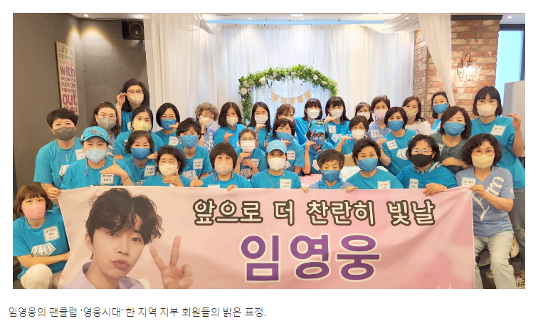 임영웅 팬클럽인 영웅시대가 수해 피를 입은 사람들을 위해 4억6천만원의 성금을 기부했다고한다. 임영웅의 팬클럽은 다양한 봉사활동을 이어오고 있으며, 이번 수해 피해자들을 위해 4억6천만원을 기부했다. 그가수의 그팬인것같다. 선한영향력을 보여주는 임영웅을 따라 팬들도 선한영향력을 많은 사람들에게 베풀고있다.