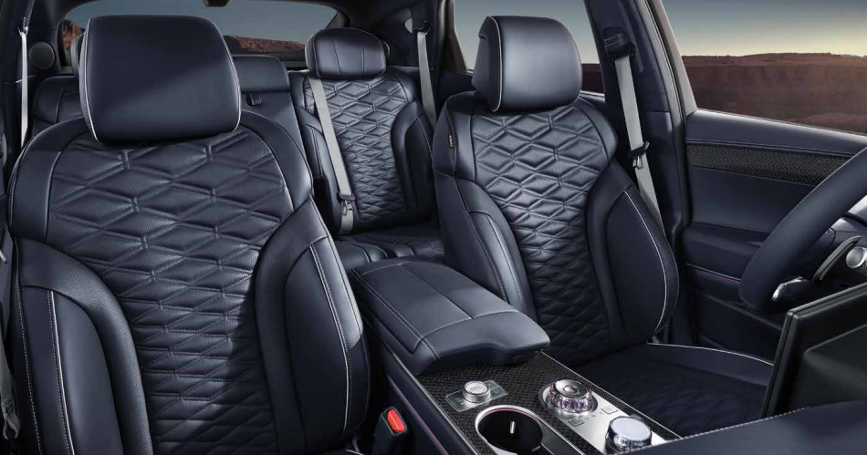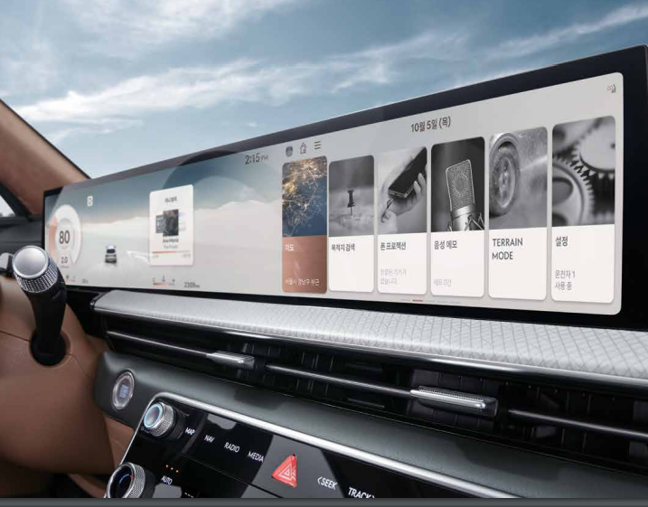 27인치 OLED 통합 디스플레이 클러스터와 내비게이션 화면을 하나의 파노라믹 디스플레이로연결하여 볼드하면서 하이테크한 실내 이미지를 강조