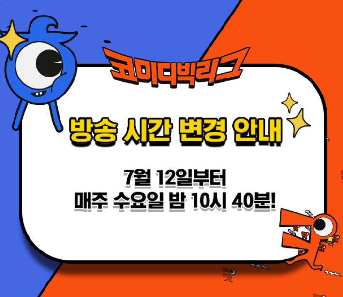코미디빅리그가 방송시간이 변경되었습니다. 7월12일 부터 매주 수요일 밤 10시 40분에 TvN 에서 시청하실수 있습니다