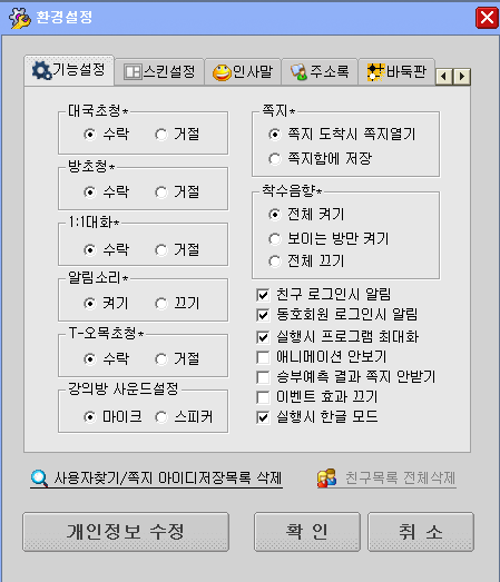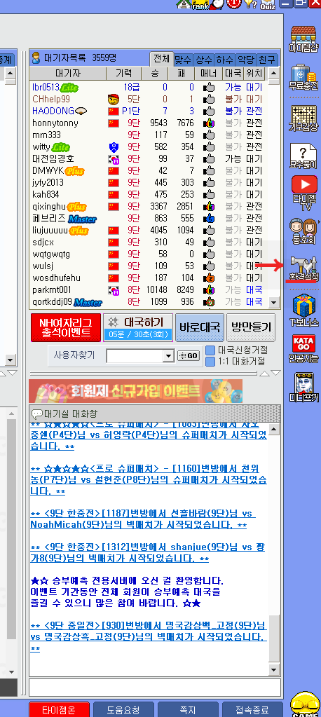 입장하시면 오른쪽에 환경설정이 있습니다. 대국초정 방초청등 거절/수락 등이 있으니 본인이 편안하시 쪽으로 설정하시고 수정진행해 주시면 됩니다.