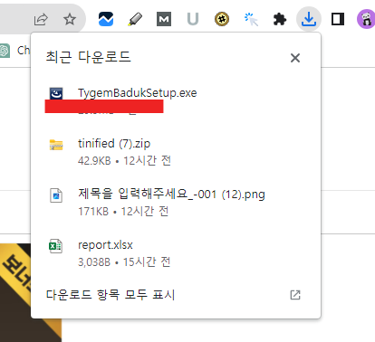 ✅대국실입장을 클릭하시면 아래화면처럼 다운로드가 완료되며 다운로드 완료된 파일을 클릭하셔서 설치해주시기 바랍니다.