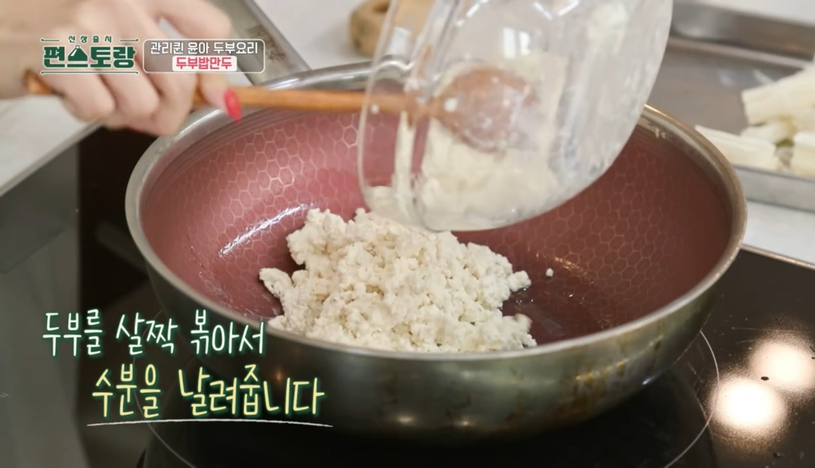1. 팬에 으깬 두부를 넣고 수분을 날릴 정도로 볶아준다.