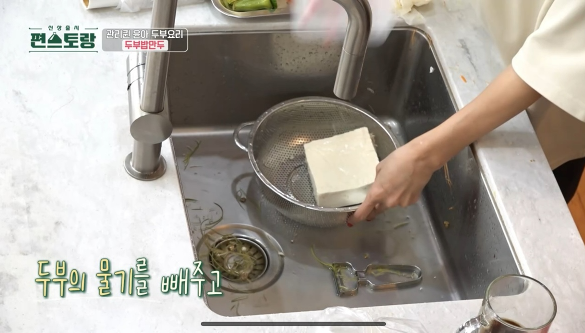 ① 두부는 체에 밭쳐 물기를 빼고 으깨준다.