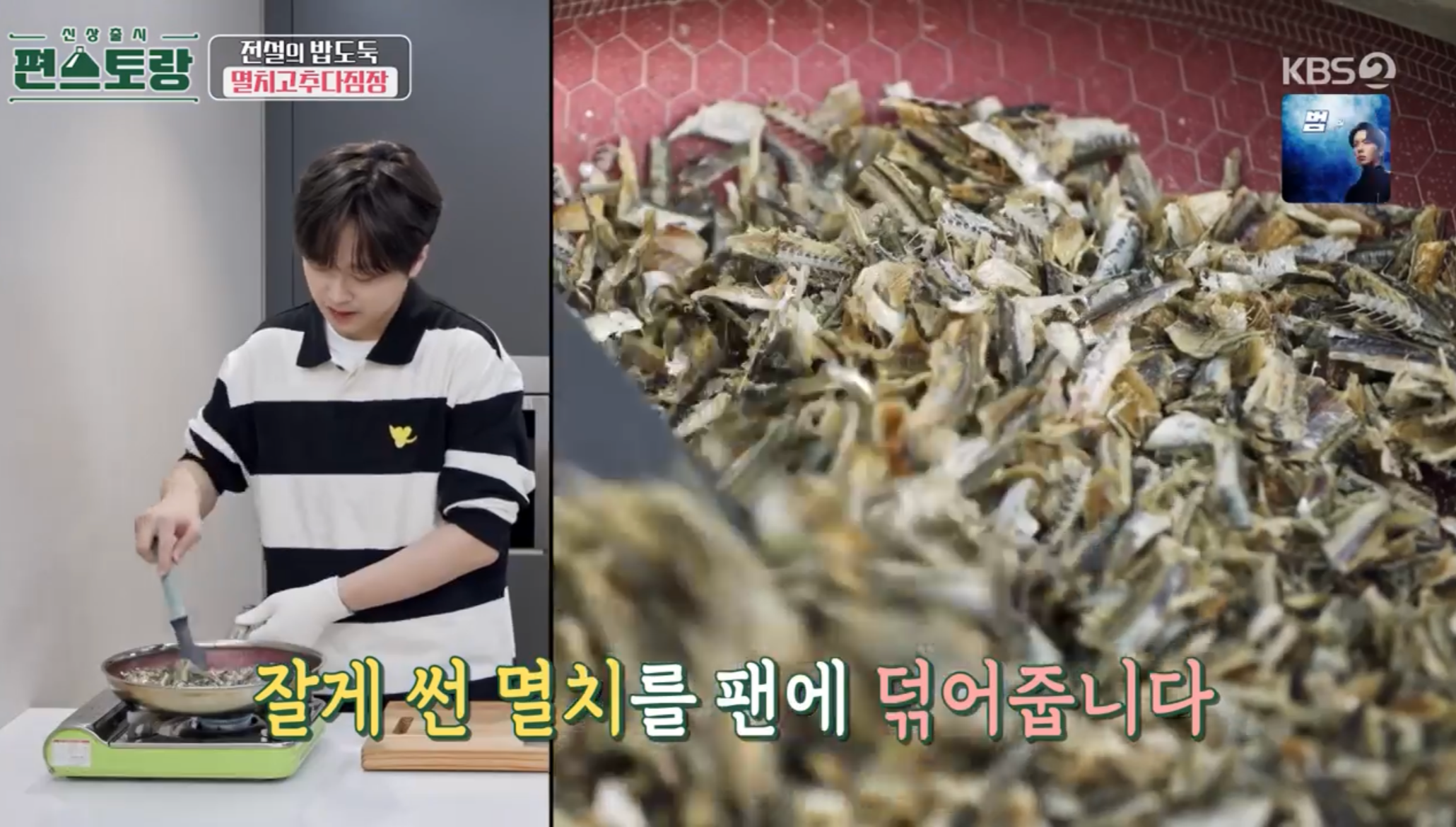 1. 마른 팬에 대가리와 내장을 제거한 멸치 60마리를 넣고 약불로 5분 정도 덖어 비린내를 날려준다.