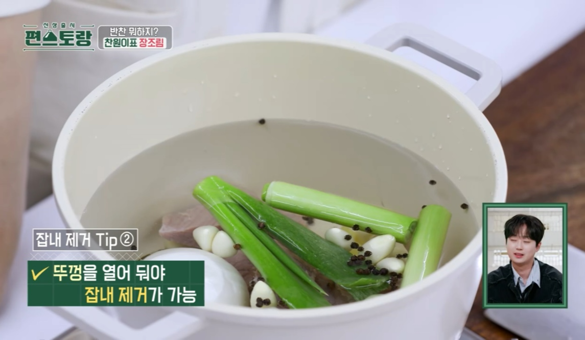 1. 냄비에 물 1L, 대파, 생강, 마늘, 양파, 후추, 닭고기를 넣어 뚜껑을 열고 센불에 10분 삶아준다.