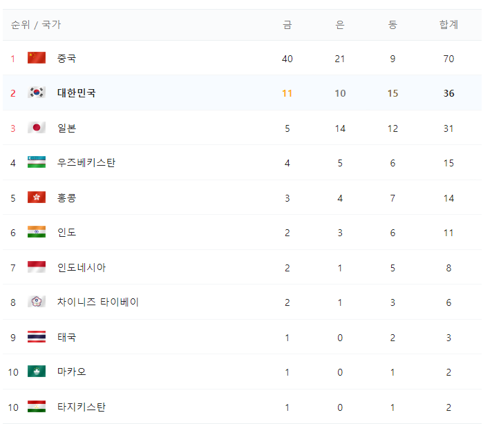 9월26일 기준 항저우 아시안게임 대한민국 메달은 금 11개 은 10개 동 15개 합계 36계로 종합 2위 입니다