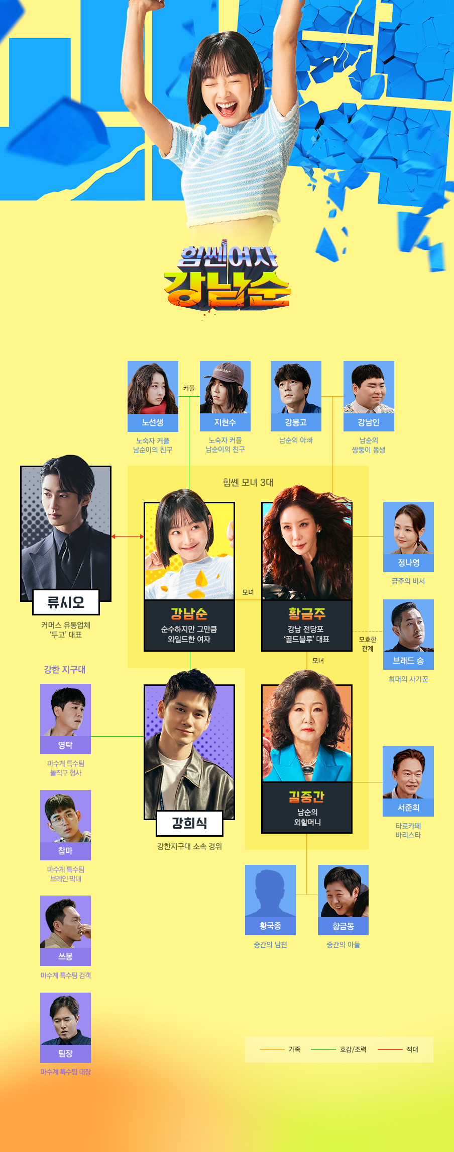 힘쎈여자 도봉순에 이어 힘쎈여자 강남순으로 돌아왔다. 마약으로 인해 더렵혀지는 세상의 구세주같은 힘쎈 3모녀의 코믹 액션 드라마이다.첫방송을 시작으로 이미 6% 시청률로 관심과 사랑을 받고 있는 힘쎈여자 강남순의 등장인물,회차정보,재방송시간등을 아래 정보를 통해 확인해보시기 바랍니다.