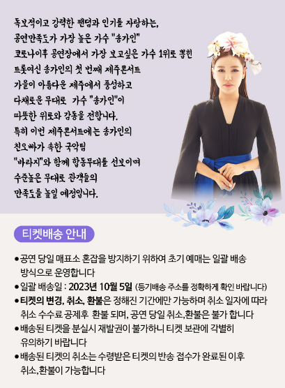 2023년 송가인 전국투어 제주 콘서트가 열립니다. 콘서트 좌석및 가격미리 알아보시고 티켓예매 진행해보실수 있게 아래 내용을 확인해주시기 바랍니다