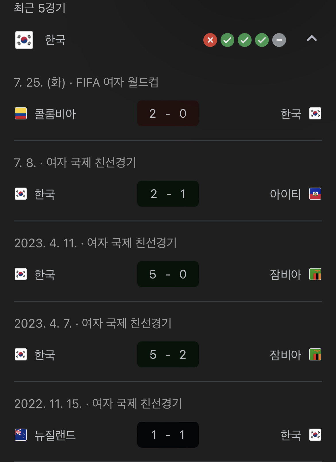 대한민국은 이번 5경기에서 3승 1무1패의 기록하였우며,모르코는 3패2무의 기록을세웠다. 7월30일 대한민국과 모르코와의 경기에 많은 관심이 쏠리고있다